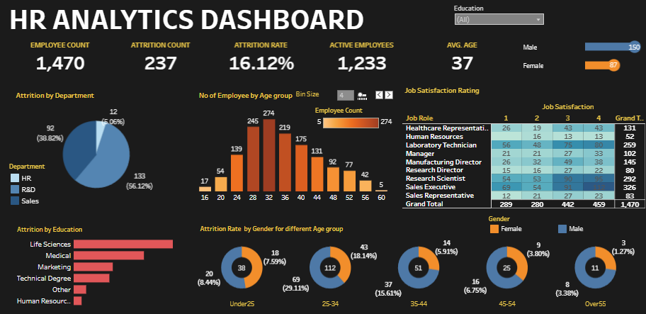 Designed a concise HR Analytics Dashboard in Tableau, highlighting a 16.12% attrition rate, 56.12% Sales department turnover, and gender-age trends across 1,470 employees. Informed HR policies to reduce attrtion in high-turnover departments.