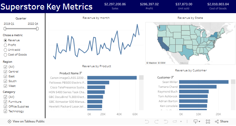 Engineered a high-impact Superstore Metrics Dashboard on Tableau, analyzing $2.3M sales, 373K profit. and revenue trends. Helped sales managers priortize high-margin products and regions.